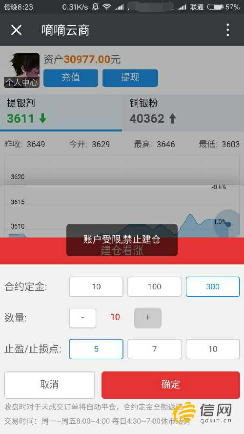 陈先生的账户受限克制建仓 赚了27000多却被封停账户 舍弃了带着节制的网友之后,陈先生开始本身节制,“从17日之后,我就本身生意业务。”陈先生说,嘀嘀云商惟独“提银剂”和“铜银粉”两种商品,他两种商品都买过,“铜银粉的颠簸大,我买的较量多。” 陈先生汇报信网,嘀嘀云商的生意业务是实现设定好生意业务的偏向和点位,到达预设就可以赚70%,如果朝相反偏向到达预设的点位数,则投入的资金全部亏掉。 2月17日之后,陈先生壹贝偾有赚有亏,“我真正赚钱是在20日和21日两天。”这两天的时间,虽然也有吃亏,可是盈利居多,两天的时间,他就赚了27000多元,“加上我的本金,账户里面总共3万多元。” 然而,陈先生还没来得及欢快,2月21日下战书,他预备提出资金时,却发明账户被封停了,“我也不知道怎么回事,当天下战书就给我封了。”信网从陈先生提供的截图上看,他的账户中资产为30977元,可是“账户受限,克制建仓”。陈先生说,此刻不只不能建仓,也不能出金。