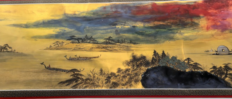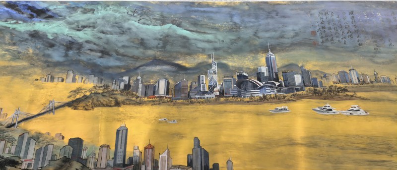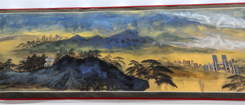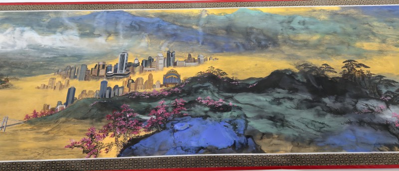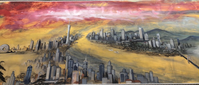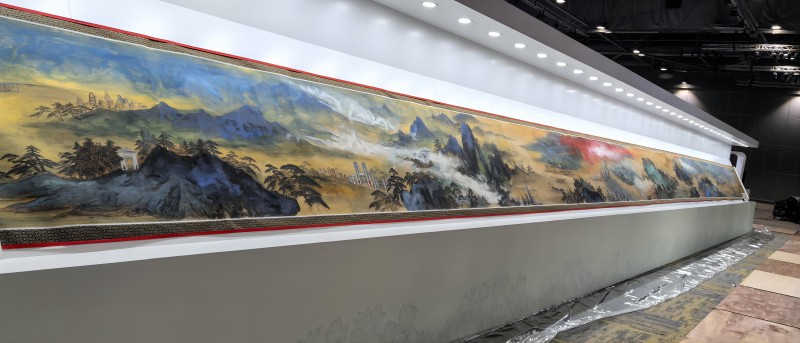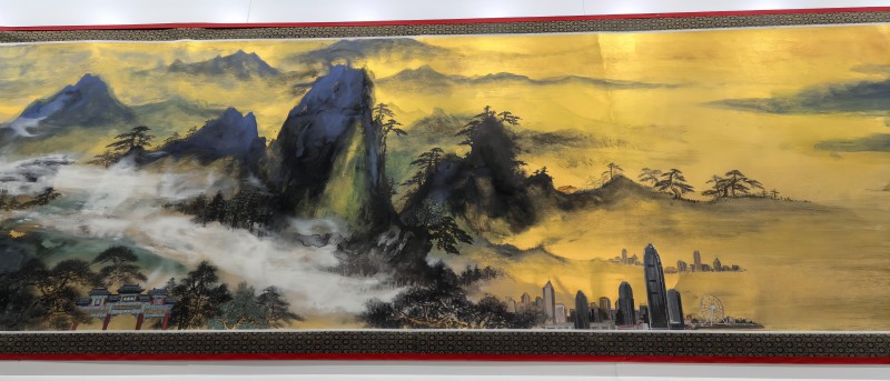 2021年底,国家一级美术师、北京大学中国传统艺术文化研究所副所长、研究员张振齐先生在深圳目睹了粤港澳大湾区日新月异的盛大变化,决定用绘画形式展现粤港澳大湾区全景式风采。张振齐先生用半年时间走遍了大湾区的11个城市,并用7个月时间在一间20平米的绘画室用纯金箔绘出了一幅长33米,宽1.2米的泼墨泼彩山水巨作。气势恢宏,描绘精细,山川楼宇,生动再现。画作完成后于2022年8月首先在海南博鳌国际论坛展出,消息传出,深圳、珠海、三亚、海口的朋友和艺术爱好者闻讯蜂拥而至。展览现场人头攒动,观者如云,盛赞之为当代之“清明上河图〞。而后于2023年10月12日在北京民族文化宫举办的“江山如此多娇——第四届当代艺术名家精品书画展暨文创高峰会”中荣获金奖。